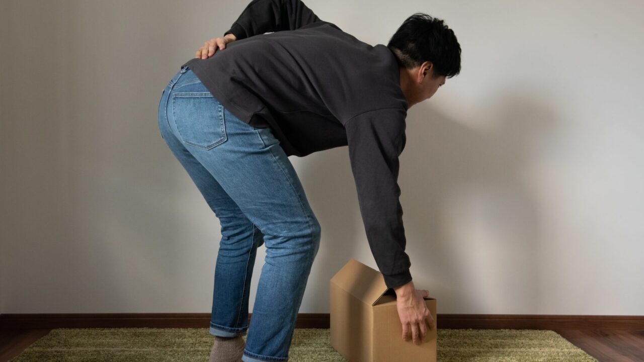 腰椎は腰を丸めた状態だと刺激されやすいです。重いものを持つ場合は腰をしっかり落とし、膝を使って持ち上げましょう。中腰の姿勢で持ち上げるのは絶対に避けてください。
